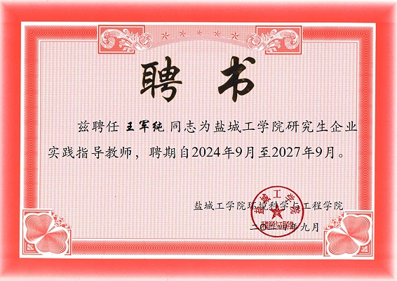 王軍純被聘為鹽城工學院環境學院兼職教授及研究生企業實踐指導教師
