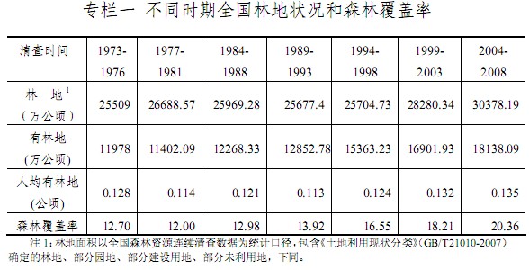 第一章 林地保護(hù)利用面臨的形勢 第一節(jié) 保護(hù)利用現(xiàn)狀 根據(jù)第七次全國森林資源清查(2004-2008 年)結(jié)果,全國林地總面積 30378.19萬公頃,占國土面積的 31.6%;森林覆蓋率 20.36%。林地中,有林地 18138.09萬公頃,灌木林地 5365.34萬公頃,疏林地 482.22萬公頃,未成林造林地 1132.63萬公頃,苗圃地 45.4 萬公頃,跡地(含采伐跡地和火燒跡地)709.61 萬公頃,宜林地 4403.54萬公頃,林業(yè)輔助用地 101.36萬公頃。  黨中央、國務(wù)院一直高度重視生態(tài)建設(shè)和林業(yè)發(fā)展,各級政府認(rèn)真貫徹落實《中華人民共和國森林法》等有關(guān)法律法規(guī)和黨中央、國務(wù)院的林業(yè)發(fā)展方針、政策,林地保護(hù)利用取得了明顯成效。 ——促進(jìn)了國土綠化和森林資源持續(xù)增長。我國森林覆蓋率已從新中國成立初期的8.6%提高到20.36%。 森林面積達(dá)到19545萬公頃,比改革開放初期增長 61%;森林蓄積量達(dá)到 137億立方米,比改革開放初期增長 34%。尤其是近 20 年來,森林面積和蓄積實現(xiàn)了持續(xù)增長。人工林面積達(dá) 6169 萬公頃,居世界第一位,占全球人工林面積的 38%。僅“十五”期間,全國植樹造林面積就達(dá) 3993萬公頃。 ——實現(xiàn)了局部生態(tài)明顯改善。改革開放以來,國家先后實施了“三北”防護(hù)林、天然林保護(hù)、退耕還林、京津風(fēng)沙源治理等重點生態(tài)工程。 “三北”防護(hù)林工程造林 2400多萬公頃,工程 區(qū)森林覆蓋率提高了1倍。 天然林保護(hù)工程有效保護(hù)天然林9500多萬公頃,減少森林資源消耗 4.26 億立方米。退耕還林工程造林 2600 多萬公頃,其中退耕地造林 900 多萬公頃,工程區(qū)森林覆蓋率提高兩個多百分點。全國沙化面積由 20 世紀(jì)末的年均擴(kuò)展約 3436平方公里變?yōu)槟壳暗哪昃s減約 1283平方公里, 總體上實現(xiàn)了從“沙逼人退”向“人逼沙退”的歷史性轉(zhuǎn)變。 ——保護(hù)了生態(tài)區(qū)位重要地區(qū)的林地資源。2001 年以來,共區(qū)劃界定國家級公益林地 10500多萬公頃, 中央財政每年支出的公益林補(bǔ)償費(fèi)已超過 30 億元;建立了各類自然保護(hù)區(qū)總面積 達(dá) 12200多萬公頃,約占國土面積的12.7%;已建森林公園 2151處,總經(jīng)營面積 1597.47萬公頃,有效保護(hù)了全國生態(tài)區(qū)位重要地區(qū)的林地及生物多樣性。新中國成立以來,國務(wù)院確定了重點國有林區(qū),并建立了一批國有林業(yè)局;還先后建立了 4466 個國林地相關(guān)概念及劃分標(biāo)準(zhǔn)林地:根據(jù)《中華人民共和國森林法實施條例》,林地包括郁閉度 0.2以上的喬木林地以及竹林地、灌木林地、疏林地、采伐跡地、火燒跡地、未成林造林地、苗圃地和縣級以上人民政府規(guī)劃的宜林地。 有林地:連續(xù)面積大于 0.067hm2、郁閉度 0.2 以上、附著有森林植被的林地,包括喬木林地和竹林地。 灌木林地:由灌木樹種或因生境惡劣矮化成灌木型的喬木樹種以及胸徑小于 2cm 的小雜竹叢組成,以經(jīng)營灌木林為目的或起防護(hù)作用,連續(xù)面積大于0.067hm2、覆蓋度在30%以上的林地。其中:國家特別規(guī)定灌木林地(特灌林地):具有一定經(jīng)濟(jì)價值,以取得經(jīng)濟(jì)效益為目的進(jìn)行經(jīng)營的灌木林,或者分布在干旱、半干旱地區(qū)和喬木生長界限以上專為防護(hù)用途,且覆蓋度大于30%的灌木林地。 疏林地: 由喬木樹種組成, 連續(xù)面積大于0.067hm2、 郁閉度在0.10-0.19之間的林地。 采伐跡地:采伐后保留木達(dá)不到疏林地標(biāo)準(zhǔn)、且尚未人工更新或天然更新達(dá)不到中等更新等級的林地。 火燒跡地:火災(zāi)后活立木達(dá)不到疏林地標(biāo)準(zhǔn)、且尚未人工更新或天然更新達(dá)不到天然幼苗3000株/hm2以上或幼樹500株/hm2以上的林地。 未成林造林地:造林或封育后不到成林年限,當(dāng)年造林成活率85%以上或保存率 80%(年均等降水量線 400mm 以下地區(qū)當(dāng)年造林成活率為 70%或保存率為 65%)以上,飛播造林后保留苗木 3000 株/hm2以上或沙區(qū)成苗 2500株/hm2以上,封育地天然幼苗 3000 株/hm2以上或幼樹 500 株/hm2以上,分布均勻,尚未郁閉但有成林希望的林地。 苗圃地:固定的林木、花卉育苗用地。 宜林地:經(jīng)縣級以上人民政府規(guī)劃為林地的土地。包括宜林荒山荒地、 宜林沙荒地和其他宜林地。 郁閉度:單位面積喬木樹冠垂直投影面積之和,用十分?jǐn)?shù)表示。 森林覆蓋率:一定行政區(qū)域范圍內(nèi)有林地與特別規(guī)定灌木林地面積占土地總面積的百分率。 有林場,重點林區(qū)的森林資源得到了有效的保護(hù)利用。 ——提高了木材及林產(chǎn)品供給能力。新中國成立 60 年來,累計為社會提供木材 60 多億立方米,人造板、地板、家具、松香等林工產(chǎn)品產(chǎn)量居世界首位,經(jīng)濟(jì)林、花卉、紫膠、活性炭等林副林特產(chǎn)品產(chǎn)量居世界前列。2008 年,我國林業(yè)產(chǎn)業(yè)產(chǎn)值達(dá)到 1.44 萬億元,林產(chǎn)品進(jìn)出口貿(mào)易額突破 700 億美元,已躍升為世界林產(chǎn)品生產(chǎn)和貿(mào)易大國。 但必須清醒地看到,我國目前仍然存在人多林少、人與林地關(guān)系緊張的矛盾,林地保護(hù)利用依然面臨著一些突出問題。 ——林地總量不足,逆轉(zhuǎn)日趨